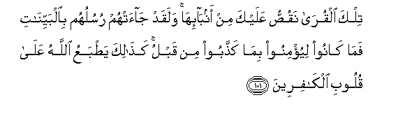101. Tilka alqura naqussu AAalayka min anba-iha walaqad jaat-hum rusuluhum bialbayyinati fama kanoo liyu/minoo bima kaththaboo min qablu kathalika yatbaAAu Allahu AAala quloobi alkafireena
