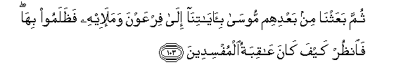 103. Then after them We sent Moses with Our signs to Pharaoh and his chiefs, but they wrongfully rejected them: So see what was the end of those who made mischief.