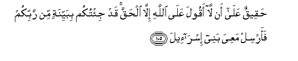 105. Haqeequn AAala an la aqoola AAala Allahi illa alhaqqa qad ji/tukum bibayyinatin min rabbikum faarsil maAAiya banee isra-eela