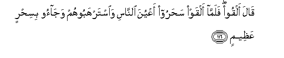 116. Qala alqoo falamma alqaw saharoo aAAyuna alnnasi waistarhaboohum wajaoo bisihrin AAatheemin