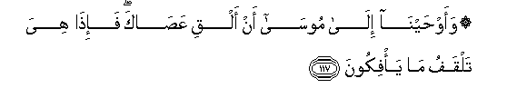 117. Waawhayna ila moosa an alqi AAasaka fa-itha hiya talqafu ma ya/fikoona