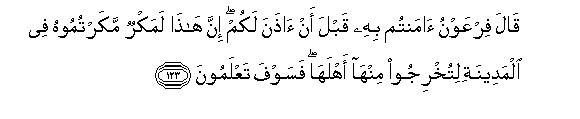 123. Qala firAAawnu amantum bihi qabla an athana lakum inna hatha lamakrun makartumoohu fee almadeenati litukhrijoo minha ahlaha fasawfa taAAlamoona