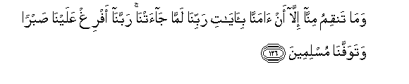 126. Wama tanqimu minna illa an amanna bi-ayati rabbina lamma jaatna rabbana afrigh AAalayna sabran watawaffana muslimeena