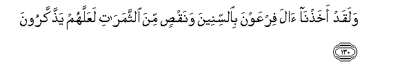 130. Walaqad akhathna ala firAAawna bialssineena wanaqsin mina alththamarati laAAallahum yaththakkaroona
