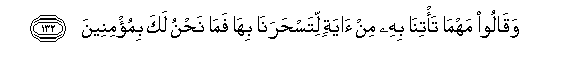 132. Waqaloo mahma ta/tina bihi min ayatin litasharana biha fama nahnu laka bimu/mineena