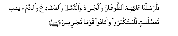 133. Faarsalna AAalayhimu alttoofana waaljarada waalqummala waalddafadiAAa waalddama ayatin mufassalatin faistakbaroo wakanoo qawman mujrimeena