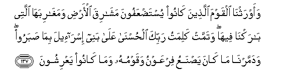 137. Waawrathna alqawma allatheena kanoo yustadAAafoona mashariqa al-ardi wamagharibaha allatee barakna feeha watammat kalimatu rabbika alhusna AAala banee isra-eela bima sabaroo wadammarna ma kana yasnaAAu firAAawnu waqawmuhu wama kanoo yaAArishoona