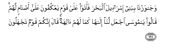 138. Wajawazna bibanee isra-eela albahra faataw AAala qawmin yaAAkufoona AAala asnamin lahum qaloo ya moosa ijAAal lana ilahan kama lahum alihatun qala innakum qawmun tajhaloona