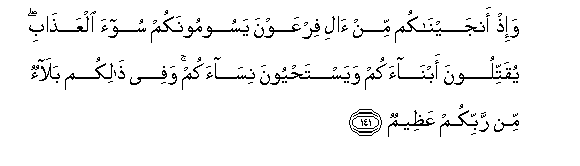 141. Wa-ith anjaynakum min ali firAAawna yasoomoonakum soo-a alAAathabi yuqattiloona abnaakum wayastahyoona nisaakum wafee thalikum balaon min rabbikum AAatheemun
