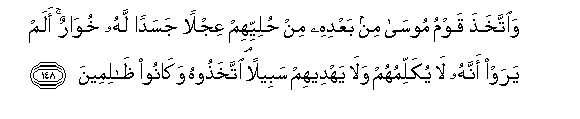 148. Waittakhatha qawmu moosa min baAAdihi min huliyyihim AAijlan jasadan lahu khuwarun alam yaraw annahu la yukallimuhum wala yahdeehim sabeelan ittakhathoohu wakanoo thalimeena