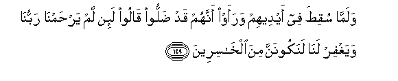 149. Walamma suqita fee aydeehim waraaw annahum qad dalloo qaloo la-in lam yarhamna rabbuna wayaghfir lana lanakoonanna mina alkhasireena