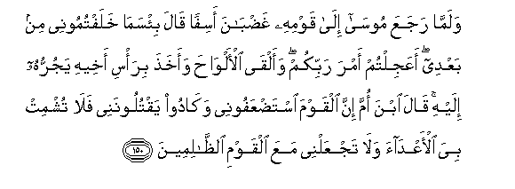 150. Walamma rajaAAa moosa ila qawmihi ghadbana asifan qala bi/sama khalaftumoonee min baAAdee aAAajiltum amra rabbikum waalqa al-alwaha waakhatha bira/si akheehi yajurruhu ilayhi qala ibna omma inna alqawma istadAAafoonee wakadoo yaqtuloonanee fala tushmit biya al-aAAdaa wala tajAAalnee maAAa alqawmi alththalimeena