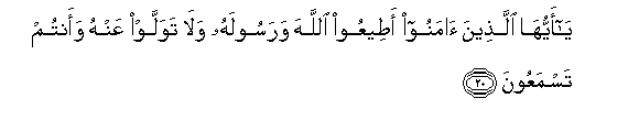 20. Ya ayyuha allatheena amanoo ateeAAoo Allaha warasoolahu wala tawallaw AAanhu waantum tasmaAAoona