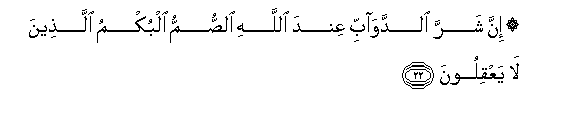 22. Inna sharra alddawabbi AAinda Allahi alssummu albukmu allatheena la yaAAqiloona
