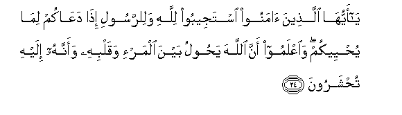 24. Ya ayyuha allatheena amanoo istajeeboo lillahi walilrrasooli itha daAAakum lima yuhyeekum waiAAlamoo anna Allaha yahoolu bayna almar-i waqalbihi waannahu ilayhi tuhsharoona