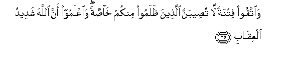 25. Waittaqoo fitnatan la tuseebanna allatheena thalamoo minkum khassatan waiAAlamoo anna Allaha shadeedu alAAiqabi