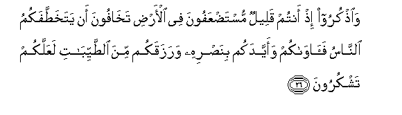 26. Waothkuroo ith antum qaleelun mustadAAafoona fee al-ardi takhafoona an yatakhattafakumu alnnasu faawakum waayyadakum binasrihi warazaqakum mina alttayyibati laAAallakum tashkuroona