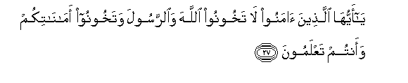 27. Ya ayyuha allatheena amanoo la takhoonoo Allaha waalrrasoola watakhoonoo amanatikum waantum taAAlamoona