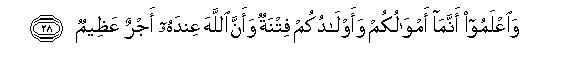 28. WaiAAlamoo annama amwalukum waawladukum fitnatun waanna Allaha AAindahu ajrun AAatheemun