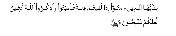 45. Ya ayyuha allatheena amanoo itha laqeetum fi-atan faothbutoo waothkuroo Allaha katheeran laAAallakum tuflihoona