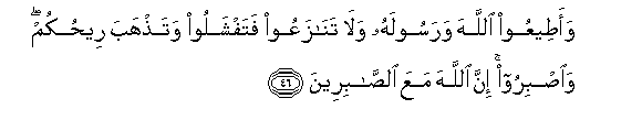 46. And obey Allah and His Messenger. and fall into no disputes, lest ye lose heart and your power depart; and be patient and persevering: For Allah is with those who patiently persevere: