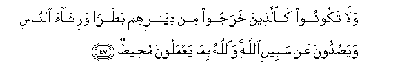 47. Wala takoonoo kaallatheena kharajoo min diyarihim bataran wari-aa alnnasi wayasuddoona AAan sabeeli Allahi waAllahu bima yaAAmaloona muheetun