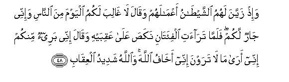 48. Wa-ith zayyana lahumu alshshaytanu aAAmalahum waqala la ghaliba lakumu alyawma mina alnnasi wa-innee jarun lakum falamma taraati alfi-atani nakasa AAala AAaqibayhi waqala innee baree-on minkum innee ara ma la tarawna innee akhafu Allaha waAllahu shadeedu alAAiqabi