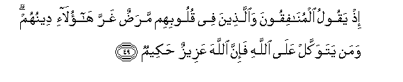 49. Ith yaqoolu almunafiqoona waallatheena fee quloobihim maradun gharra haola-i deenuhum waman yatawakkal AAala Allahi fa-inna Allaha AAazeezun hakeemun