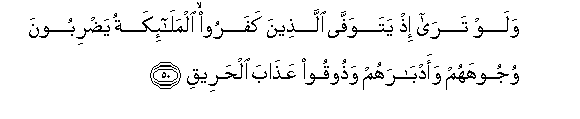 50. Walaw tara ith yatawaffa allatheena kafaroo almala-ikatu yadriboona wujoohahum waadbarahum wathooqoo AAathaba alhareeqi