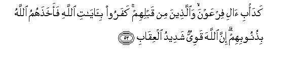 52. "(Deeds) after the manner of the people of Pharaoh and of those before them: They rejected the Signs of Allah, and Allah punished them for their crimes: for Allah is Strong, and Strict in punishment: