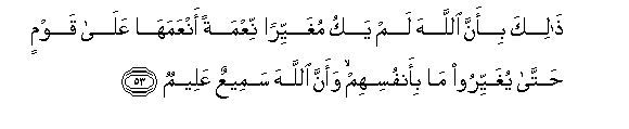 53. Thalika bi-anna Allaha lam yaku mughayyiran niAAmatan anAAamaha AAala qawmin hatta yughayyiroo ma bi-anfusihim waanna Allaha sameeAAun AAaleemun