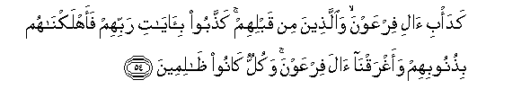 54. (Deeds) after the manner of the people of Pharaoh and those before them": They treated as false the Signs of their Lord: so We destroyed them for their crimes, and We drowned the people of Pharaoh: for they were all oppressors and wrong- doers.