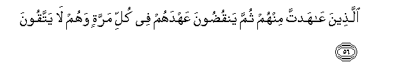 56. Allatheena AAahadta minhum thumma yanqudoona AAahdahum fee kulli marratin wahum la yattaqoona