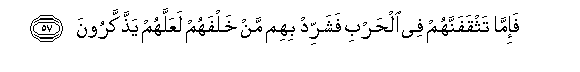 57. Fa-imma tathqafannahum fee alharbi fasharrid bihim man khalfahum laAAallahum yaththakkaroona