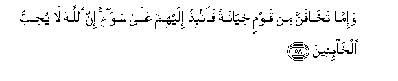 58. Wa-imma takhafanna min qawmin khiyanatan fainbith ilayhim AAala sawa-in inna Allaha la yuhibbu alkha-ineena