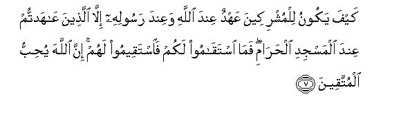 7. Kayfa yakoonu lilmushrikeena AAahdun AAinda Allahi waAAinda rasoolihi illa allatheena AAahadtum AAinda almasjidi alharami fama istaqamoo lakum faistaqeemoo lahum inna Allaha yuhibbu almuttaqeena