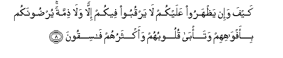 8. Kayfa wa-in yathharoo AAalaykum la yarquboo feekum illan wala thimmatan yurdoonakum bi-afwahihim wata/ba quloobuhum waaktharuhum fasiqoona