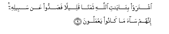 9. Ishtaraw bi-ayati Allahi thamanan qaleelan fasaddoo AAan sabeelihi innahum saa ma kanoo yaAAmaloona