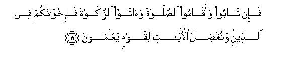 11. Fa-in taboo waaqamoo alssalata waatawoo alzzakata fa-ikhwanukum fee alddeeni wanufassilu al-ayati liqawmin yaAAlamoona