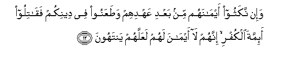 12. Wa-in nakathoo aymanahum min baAAdi AAahdihim wataAAanoo fee deenikum faqatiloo a-immata alkufri innahum la aymana lahum laAAallahum yantahoona