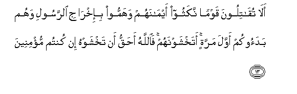 13. Ala tuqatiloona qawman nakathoo aymanahum wahammoo bi-ikhraji alrrasooli wahum badaookum awwala marratin atakhshawnahum faAllahu ahaqqu an takhshawhu in kuntum mu/mineena