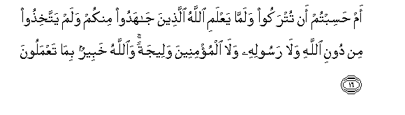 16. Am hasibtum an tutrakoo walamma yaAAlami Allahu allatheena jahadoo minkum walam yattakhithoo min dooni Allahi wala rasoolihi wala almu/mineena waleejatan waAllahu khabeerun bima taAAmaloona