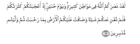 25. Laqad nasarakumu Allahu fee mawatina katheeratin wayawma hunaynin ith aAAjabatkum kathratukum falam tughni AAankum shay-an wadaqat AAalaykumu al-ardu bima rahubat thumma wallaytum mudbireena