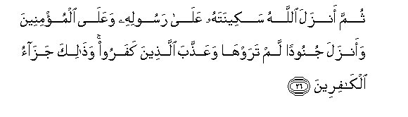 26. Thumma anzala Allahu sakeenatahu AAala rasoolihi waAAala almu/mineena waanzala junoodan lam tarawha waAAaththaba allatheena kafaroo wathalika jazao alkafireena