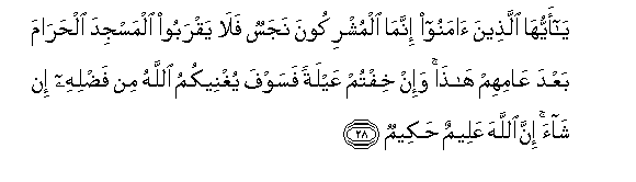 28. Ya ayyuha allatheena amanoo innama almushrikoona najasun fala yaqraboo almasjida alharama baAAda AAamihim hatha wa-in khiftum AAaylatan fasawfa yughneekumu Allahu min fadlihi in shaa inna Allaha AAaleemun hakeemun
