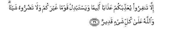 39. Illa tanfiroo yuAAaththibkum AAathaban aleeman wayastabdil qawman ghayrakum wala tadurroohu shay-an waAllahu AAala kulli shay-in qadeerun