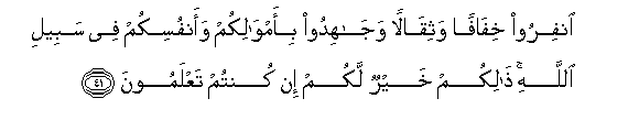 41. Infiroo khifafan wathiqalan wajahidoo bi-amwalikum waanfusikum fee sabeeli Allahi thalikum khayrun lakum in kuntum taAAlamoona