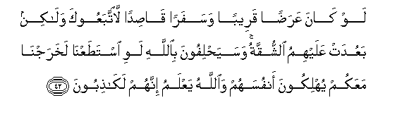 42. If there had been immediate gain (in sight), and the journey easy, they would (all) without doubt have followed thee, but the distance was long, (and weighed) on them. They would indeed swear by Allah, "If we only could, we should certainly have come out with you": They would destroy their own souls; for Allah doth know that they are certainly lying.