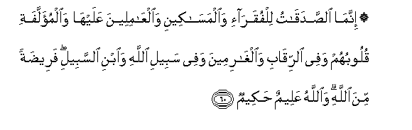 60. Innama alssadaqatu lilfuqara-i waalmasakeeni waalAAamileena AAalayha waalmu-allafati quloobuhum wafee alrriqabi waalgharimeena wafee sabeeli Allahi waibni alssabeeli fareedatan mina Allahi waAllahu AAaleemun hakeemun