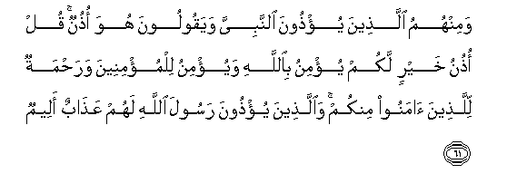 61. Waminhumu allatheena yu/thoona alnnabiyya wayaqooloona huwa othunun qul othunu khayrin lakum yu/minu biAllahi wayu/minu lilmu/mineena warahmatun lillatheena amanoo minkum waallatheena yu/thoona rasoola Allahi lahum AAathabun aleemun